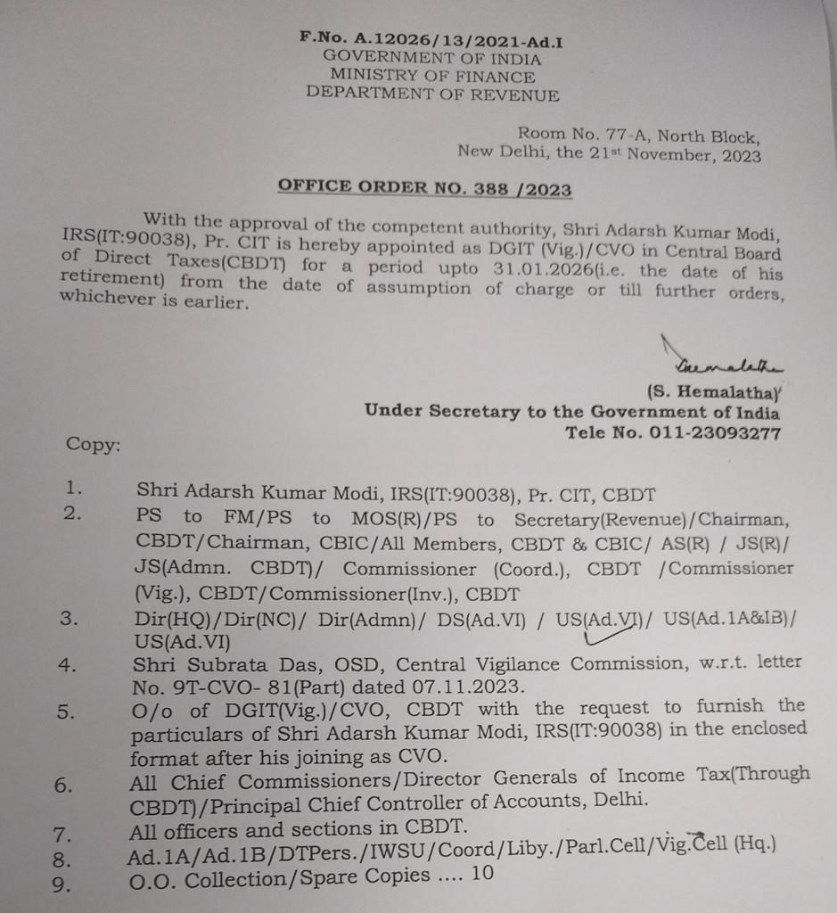 Senior Indian Revenue Service (IRS) officer of Income Tax cadre, Adarsh Kumar Modi has been appointed as the Director General of Income Tax (DGIT) Vigilance in the Central Board of Direct Taxes (CBDT), a Finance Ministry order said. Modi's tenure will end on January 31, 2026, which is the date of his superannuation. His appointment order was issued on Tuesday evening.