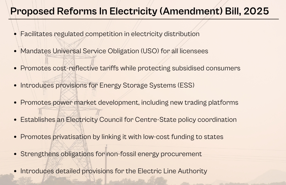 The Electricity (Amendment) Bill, 2025, proposed to resolve deep-rooted inefficiencies, ease financial strain, promote competition, and optimise network cost in the electricity sector.