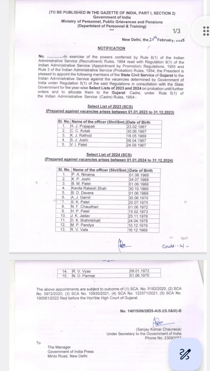 The Department of Personnel & Training (DoPT) under the Government of India, in an order dated February 20, 2025 said, “In exercise of the powers conferred by Rule 8(1) of the Indian Administrative Service (Recruitment) Rules, 1954 read with Regulation 9(1) of the Indian Administrative Service (Appointment by Promotion) Regulations, 1955 and Rule 3 of the Indian Administrative Service (Probation) Rules, 1954, the President is pleased to appoint the following members of the State Civil Service of Gujarat to the Indian Administrative Service”.