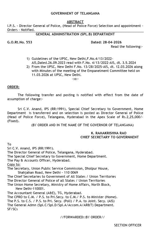 The Telangana government on Tuesday (28.04.2026) appointed CV Anand (IPS, 1991) as the new Director General of Police (DGP) of the state. He succeeds B. Shivadhar Reddy, who is retiring on April 30, 2026.