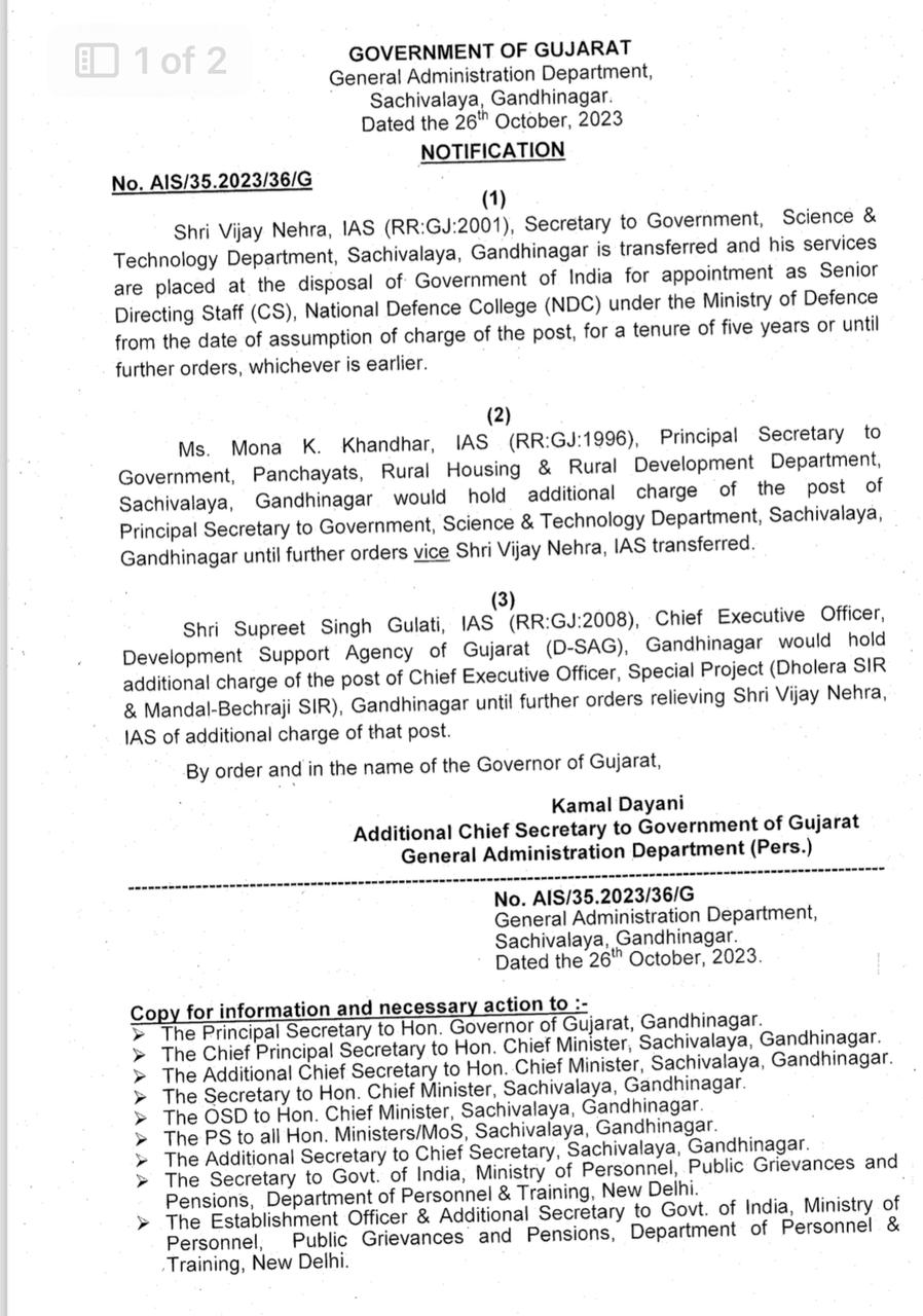 The Gujarat government on Thursday relieved senior IAS officer Vijay Nehra, who served as the secretary for the state’s science and technology department, to take up his new assignment at the Centre. Nehra held an additional charge as the CEO of the Special Project of Dholera SIR and Mandal-Bechraji SIR.