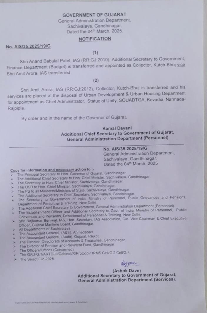 Amit Arora, who had been serving as the Collector of Kutch, has been reassigned to a new role at the iconic Statue of Unity in Kevadia. Initially, there was speculation that he might continue as a Collector in another district, but instead, he will now take charge as the Chief Administrator of the renowned tourist site.