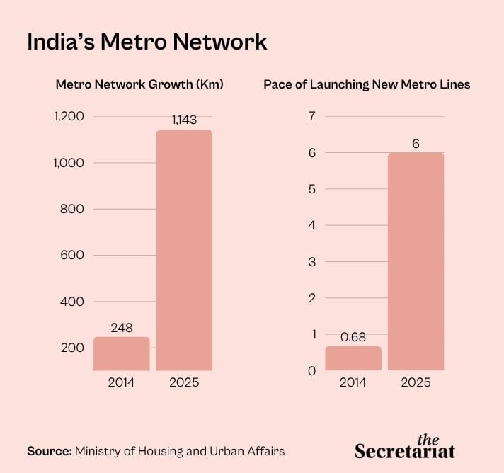 The Metro Rail Policy 2017 facilitated the rapid expansion of the metro network across the country by emphasising a structured, integrated framework through which the Central government supported the respective state governments in improving the private-sector-driven urban transport systems.