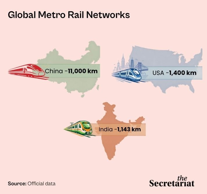 According to Minister of State for Housing and Urban Affairs Tokhan Sahu, India currently has the world’s third-largest metro network after China and the US. The average daily ridership on metro systems has reached about 12.2 million passengers. The pace of launching new metro lines has also increased from 0.68 kilometres per month (2014) to six kilometres per month (2025).
