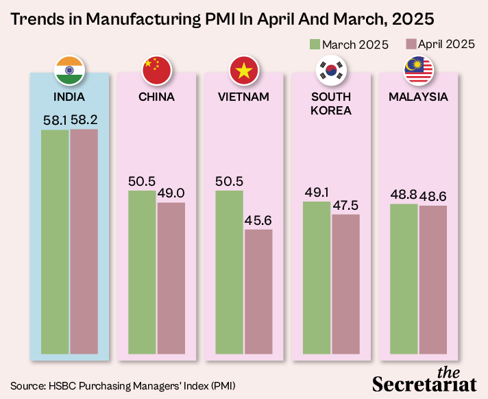 Statistics culled from the HSBC Manufacturing Purchasing Managers’ Index (PMI) for April show that India performed far better than Asian rivals China, South Korea, Vietnam, and Malaysia.