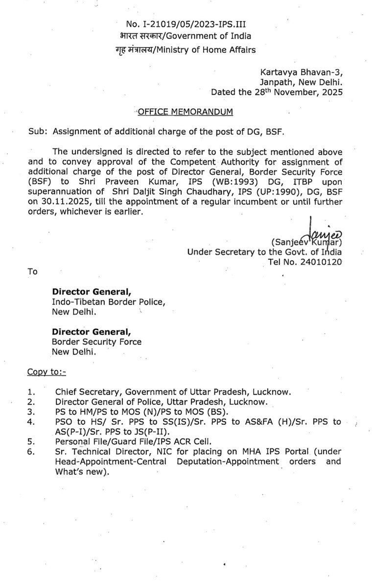The Central government has assigned the additional charge of the post of Director General (DG) of the Border Security Force (BSF) to 1993-batch IPS officer Praveen Kumar, who is currently serving as the DG of Indo-Tibetan Border Police (ITBP). The appointment comes as Daljit Singh Chaudhary, the outgoing BSF chief and a 1990-batch IPS officer of the Uttar Pradesh cadre, superannuates at the end of November.