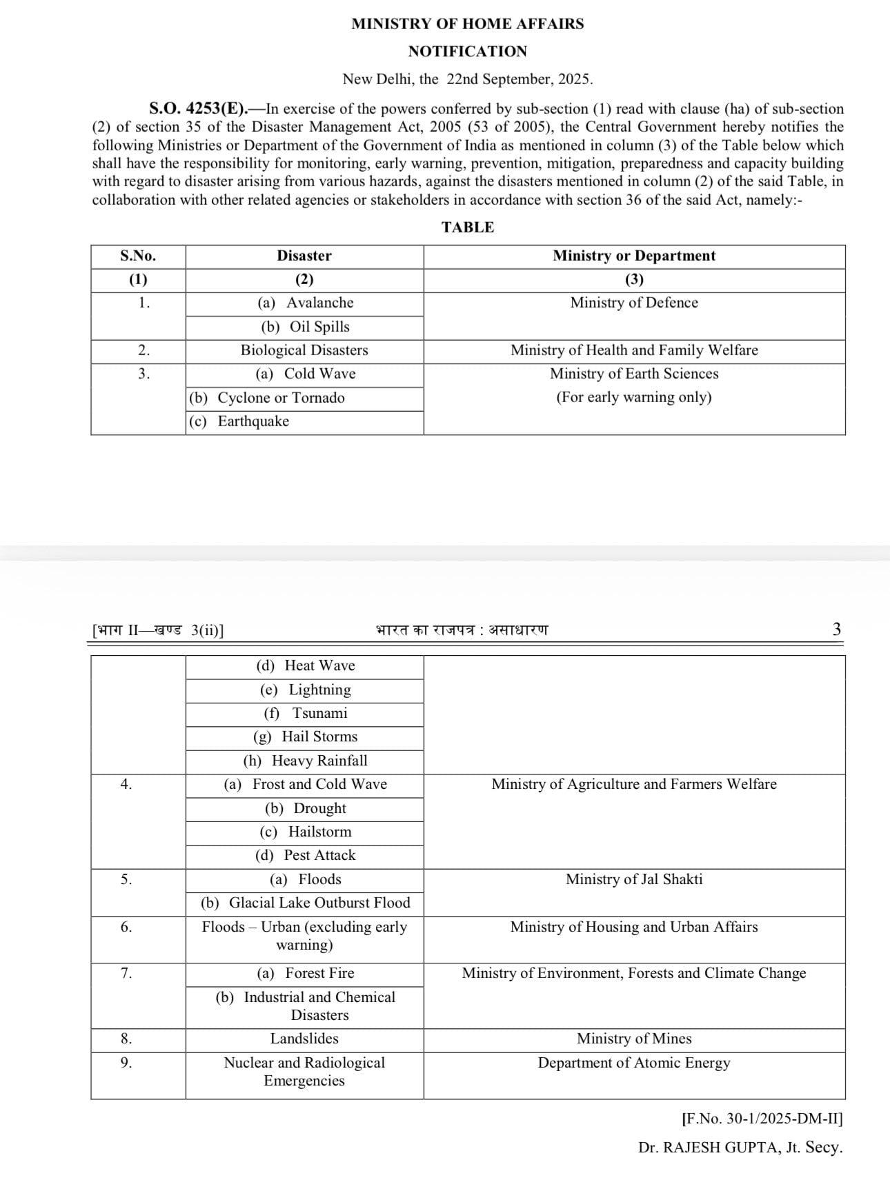 The Ministry of Jal Shakti will handle floods and glacial lake outbursts, while the Ministry of Housing and Urban Affairs will act during urban floods (excluding early warning), the notification said.