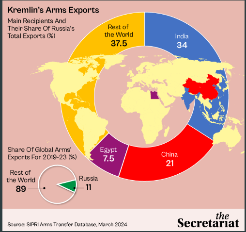 That having been said, India’s overall dependence on Russian made armaments declined as Kremiln’s share of New Dehi’s arms imports shrank from 76 per cent in 2009–13 to 36 per cent in 2019–23.