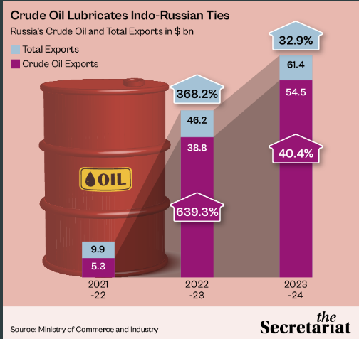 In 2021-22, trade between India and Russia accounted for a mere 1.3 per cent of the former’s overall commerce. Tellingly, by 2023-24, Russia was India’s third-largest source of imports, next only to China and the European Union. With the West boycotting Russian oil, India’s crude imports from Russian ports jumped more than 10-fold, from just US$ 5.25 billion 2021-22 to a whopping US$54.51 billion in 2023-24.