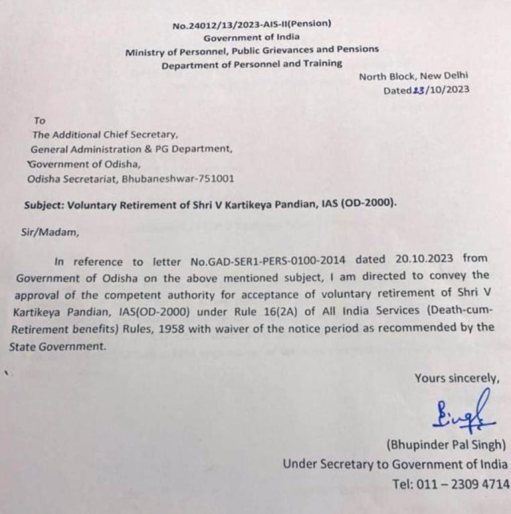 In a letter to the Odisha government, the Centre conveyed the approval of acceptance of the voluntary retirement of Pandian “under Rule 16(2A) of the All India Services (Death-cum-Retirement benefits) Rules, 1958 with waiver of the notice period as recommended by the state government”.