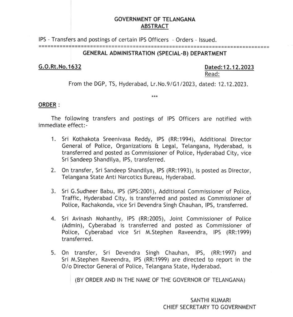 According to an order issued by the State Chief Secretary Santhi Kumari, Kothakota Sreenivasa Reddy, a 1994-batch IPS officer, has been made the new police chief of Hyderabad. He has been moved out of a non-executive role as Additional Director General (Organisation and Legal) in the police department.