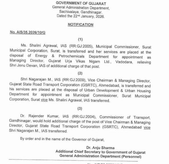 Meanwhile, M. Nagarajan, who was serving as Managing Director of the Gujarat State Road Transport Corporation (GSRTC) in Ahmedabad, has been appointed as the Municipal Commissioner of Surat.