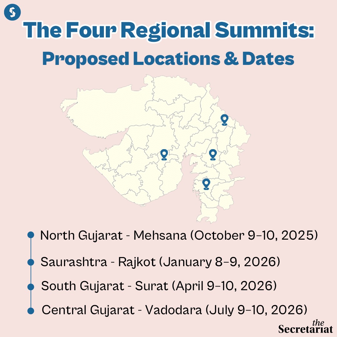 According to the state Industries Department, the first summit will be held in Mehsana on October 9-10 this year, followed by three in 2026 — Rajkot in January, Surat in April, and Vadodara in July. These cities will host two-day events with a focus on key sectors relevant to it, ranging from agri-processing and auto components to FinTech and semiconductors.